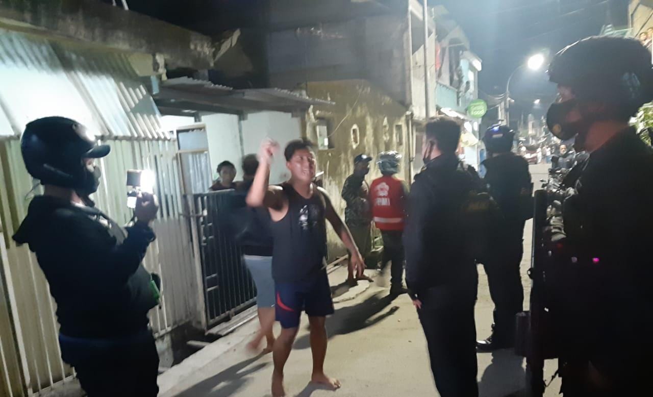 Team patroli Brimob Jabar DPP Aiptu Sutriana mendampingi Team Prabu Polrestabes Bandung Polda Jabar mencari oknum masyarakat yang melakukan tawuran di Antapani, dengan menyisir di sekitar tempat kejadian tawuran tersebut, Jum’at (14/5/2021).