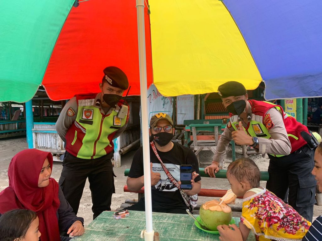 Personil Samapta tersebut mendatangi para pengunjung pantai yang sedang bermain, kemudian para wisatawan yang kedapatan tidak menggunakan masker langsung diberi masker.