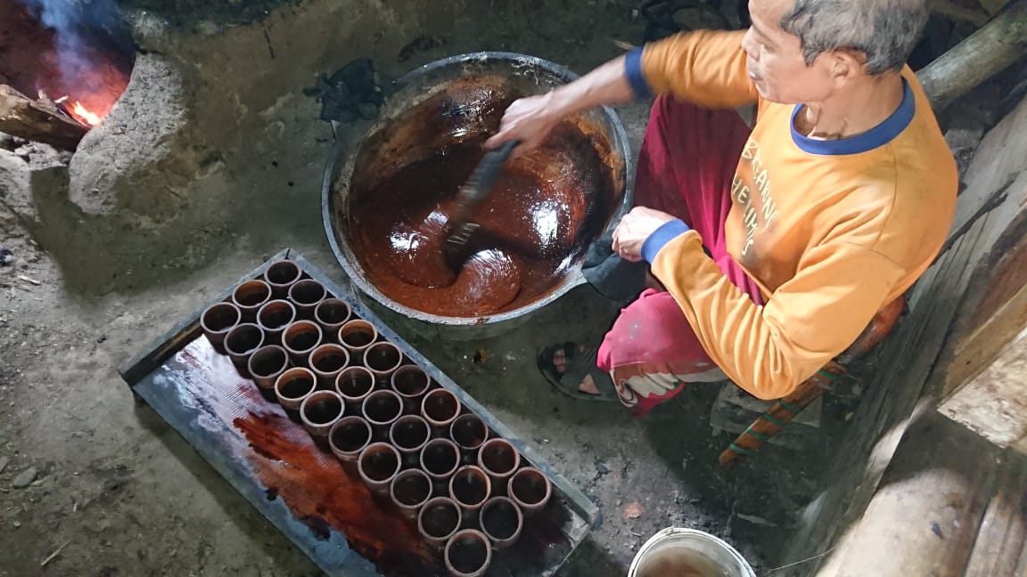 ” Air bunga pohon nira ini asli tanpa dicampur apa – apa, pertama direbus sekitar 2, 5 jam, kemudian dipindahkan ke tempat kuali atau belanga diaduk sampai kental. Setelah itu masukan ke cetakan, tunggu 10 menit agar beku dan bisa dicopot dari cetakan,” ungkapnya.