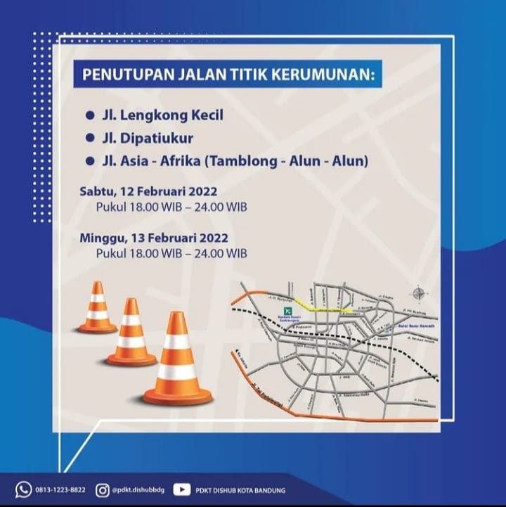 “Penutupan Jalan berlaku mulai hari Sabtu 12 Februari 2022 dan Minggu 13 Februari 2022. Mulai pukul 18.00 WIB – 24.00 WIB”, ungkap Asep Kuswara.