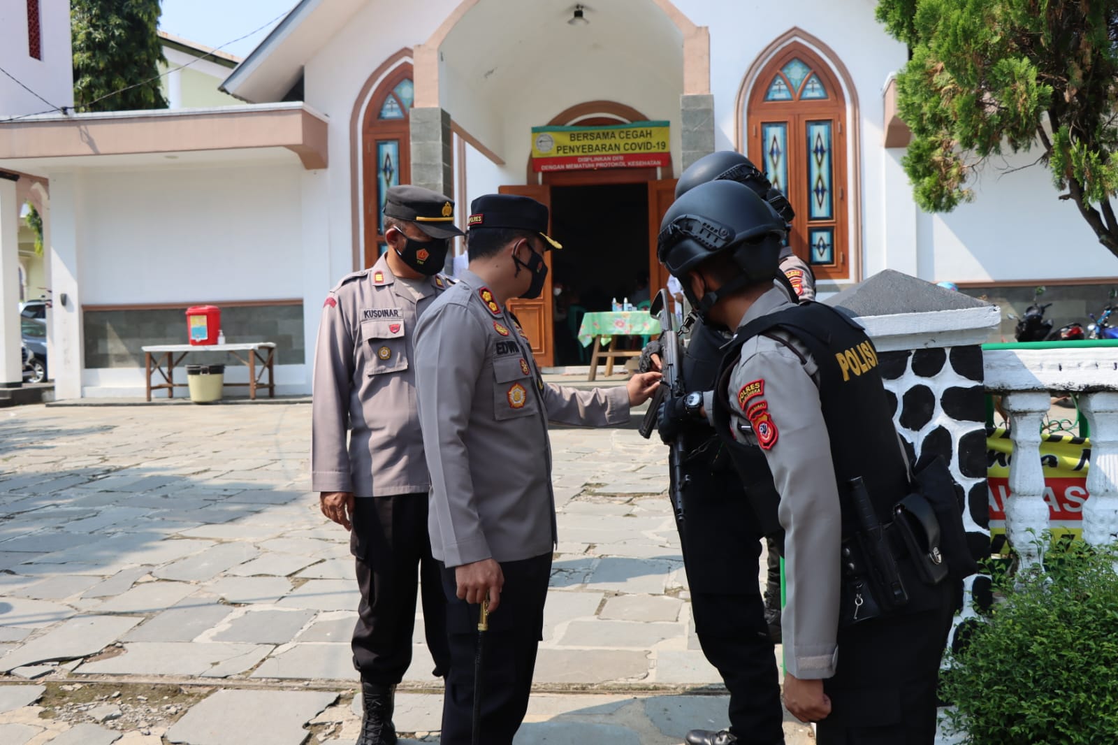 Gerbang Media Nasional Laporan : M Taufik MAJALENGKA, GMN – Kepala Kepolisian Resor Majalengka Polda Jabar AKBP Edwin Affandi melakukan pengecekan pengamanan Ibadah Jumat Agung dalam rangka memperingati wafat Isa Al Masih di sejumlah Gereja Wilayah hukum Polres Majalengka Polda Jabar, Jumat (15/4/2022). Kapolres Majalengka Polda Jabar AKBP Edwin Affandi didampingi Kabag Ops AKP Kusdinar dan Kasat Intelkam AKP Djonnaidi melakukan pengecekan personel yang bertugas pengamanan di gereja Panthekosta di Indonesia (GPdI) Majalengka dan Gereja Kristen Pasundan (GKP) Jemaat Cideres Kadipaten yang merupakan salah satu rangkaian ibadah Hari Peringatan hari Wafat Isa Al-Masih tahun 2022. Kabid Humas Polda Jabar Kombes Pol. Ibrahim Tompo S.I.K., M.Si mengatakan kegiatan pengamanan ini dilakukan guna menciptakan rasa aman dan nyaman terhadap umat kristiani yang melaksanakan ibadah dalam rangka memperingati hari wafat Isa Al-Masih khususnya di wilayah Hukum Polres Majalengka Polda Jabar. “Diharapkan agar anggota menjaga penampilan dan sikap tampang sebagai anggota Polri. Saya mengimbau agar anggota Polri yang melakukan pengamanan, sebelum pelaksanaan ibadah dimulai agar bersama petugas pengamanan internal gereja/panitia untuk melakukan pemeriksaan terhadap setiap sudut obyek pengamanan,” ujar Kapolres. Selanjutnya lakukan penjagaan dengan sungguh-sungguh dan selalu waspada serta merespon terhadap hal-hal yang dianggap mencurigakan serta melaporkan setiap perkembangan situasi kepada pimpinan atau komando. Kapolres menjelaskan bahwa pengecekan yang dilakukannya tersebut dikandung maksud untuk memastikan bahwa anggota yang melakukan tugas pengamanan di gereja agar selalu waspada dan tanggap sesuai dengan Standar Operasinal Prosedur pengamanan. Sehingga masyarakat yang melaksanakan ibadah perayaan hari Wafatnya Yesus Kristus tahun 2022 merasa aman dan nyaman kepada seluruh umat nasrani yang melaksanakan Ibadah. Jelas Kapolres Majalengka Polda Jabar Lebih lanjut Kapolres menambahkan, Para jemaat tetap dihimbau mematuhi protokol kesehatan yaitu 5M atau memakai masker, cuci tangan dan menjaga jarak, itu menjadi salah satu bentuk cara memutus mata rantai virus Covid-19. Pungkasnya. Post navigation Saat Patroli, Dengan Sigap Polisi Bantu Evakuasi Korban Kecelakaan Jelang Arus Mudik-Balik Lebaran 2022, Polisi Cek Jalur dan Kesiapan Pos Pelayanan Res Area
