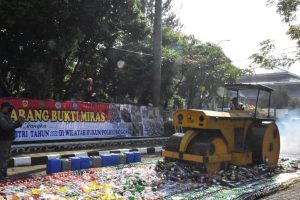BOGOR, GMN – Polres Bogor, Sat Narkoba Polres Bogor musnahkan miras hasil Ops Pekat Lodaya 2022 bertempat di Lapangan Tegar Beriman Cibinong, Jumat (22/04/2022).