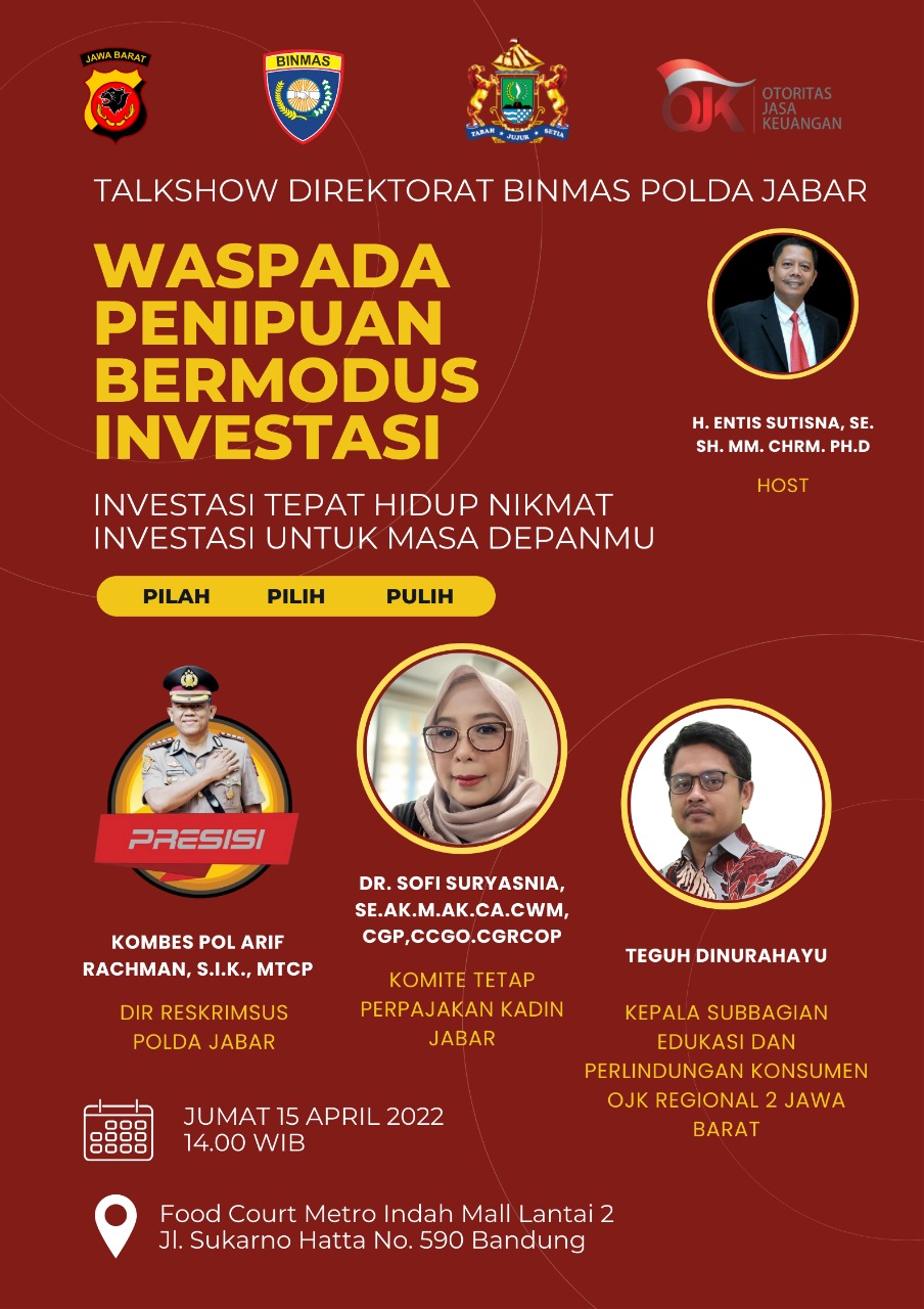 Gerbang Media Nasional Laporan : M Taufik BANDUNG, GMN – Telah dilaksanakan kegiatan Talk Show Direktorat Binmas Polda Jabar dengan tema waspada penipuan bermodus investasi, bertempat di lantai 2 Metro Indah Mall Bandung, Jum’at (15/4/2022). Hadir pada kegiatan tersebut Dir Binmas Polda Jabar, Kanit Perbankan Dit Reskrimsus Polda Jabar, Komite tetap perpajakan Kadin Jabar, Kepala Sub Bagian edukasi dan perlindungan konsumen OJK Regional.2 Jabar dan masyarakat Jabar. Dir Binmas Polda Jabar Kombes Pol. Idil Tabransyah S.H., M.M mengatakan bahwa investasi merupakan salah satu cara untuk meningkatkan nilai tambah dari suatu dana atau uang yang dimiliki seorang investor ke suatu bidang usaha atau bisnis yang dijalankan oleh penawar atau investasi dengan menanamkan dana yang dimilikinya ke sebuah bidang usaha atau bisnis. Seorang investor berhak atas sejumlah laba yang telah ditentukan dalam suatu perjanjian, sedangkan dari sisi pelaku bisnis baik berupa perusahaan ataupun perorangan dana dari para investor sangat berguna sebagai sumber pembiayaan eksternal yang sangat bermanfaat untuk meningkatkan orang yang menginvestasikan uangnya yang berasal dari kalangan masyarakat. Dari sedemikian banyak orang yang menginvestasikan uangnya, beragam pula tujuan mereka berinvestasi, dengan tujuan utama ingin meraih keuntungan atau paling tidak mempertahankan kekayaan kepada pelaku bisnis , baik perorangan maupun perusahaan. Dir Binmas menuturkan tidak semuanya dapat mencapai tujuan tersebut, banyak dari mereka yang tidak memperoleh keuntungan tetapi malah menjadi korban penipuan oleh pihak – pihak yang tidak bertanggung jawab. Kasus penipuan berkedok investasi terus terjadi berulang, bahkan semakin lama semakin banyak dengan modus – modus yang semakin canggih. “Adanya tindak pidana penipuan berkedok investasi melalui sistem online merupakan fenomena sosial yang seperti gunung es dimana kasus yang dilaporkan kepada Polisi lebih sedikit dibanding kejahatan yang ada.” ujar Dir Binmas Polda Jabar Berdasarkan Pasal 13 UU Nomor 2 tahun 2002 tentang Kepolisian Negara Republik Indonesia yang menetapkan tugas – tugas yang diemban Polisi berupa memelihara Kamtibmas, menegakan hukum dan memberikan perlindungan, pengayoman dan pelayanan kepada masyarakat maka kejahatan penipuan betkedok investasi melalui sistem online dapat ditanggulangi, diminimalisir bahkan diberantas. Post navigation Unjuk Rasa Di Depan Gedung Sate Bandung, Berjalan Dengan Aman Dan Terkendali Kapolda Jabar Pimpin Pembukaan Rakernis Fungsi Pam Obvit Polda Jabar Tahun Anggaran 2022