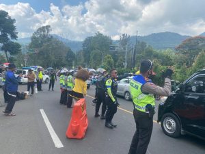 BOGOR, GMN – Berikan hiburan kepada pengendara yang menunggu pemberlakuan Oneway di jalur puncak, Sat Lantas Polres Bogor bagikan makanan ringan dan datang kan badut hingga live musik untuk menghibur.