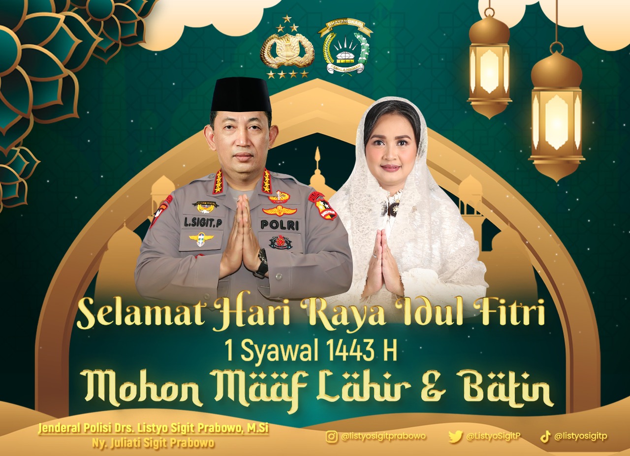 Gerbang Media Nasional Laporan : M Taufik Jakarta, GMN – Kapolri Jenderal Listyo Sigit Prabowo menyampaikan selamat merayakan Hari Raya Idul Fitri 1443 Hijriah kepada seluruh umat Muslim di Indonesia. Ia berharap perayaan ini dapat dijadikan momentum untuk seluruh masyarakat kembali ke fitrah. “Di tengah gema takbir yang berkumandang di hari fitrah, saya Jenderal Polisi DRS. Listyo Sigit Prabowo, M.SI Kepala Kepolisian Negara Republik Indonesia (Kapolri), mengucapkan selamat Hari Raya Idul Fitri 1443 Hijriah. Minal Aidin Wal Faizin, mohon maaf lahir dan batin, kepada seluruh umat muslim di Indonesia,” kata Sigit dalam tayangan videonya, Minggu (1/5/2022). Pemerintah Indonesia melalui Kementerian Agama (Kemenag) telah menetapkan Hari Raya Idul Fitri atau Lebaran pada hari Senin, 2 Mei 2022. Sigit mengungkapkan, perayaan Hari Raya Idul Fitri ini juga diharapkan bisa menjadi momentum bagi seluruh masyarakat untuk kembali menjadi pribadi yang memiliki akhlak terpuji. “Mari kita sambut hari kemenangan ini dengan penuh kebahagiaan dan rasa syukur untuk kembali ke fitrah manusia serta sucikan hati untuk menjadi pribadi yang Akhlakul Karimah,” ujar mantan Kabareskrim Polri ini. Lebih dalam, Sigit juga berharap Hari Raya Idul Fitri dapat menjadi momentum untuk memperkuat tali persaudaraan dan persatuan, demi mewujudkan Indonesia yang tangguh dan tumbuh. “Semoga Allah SWT, melimpahkan rahmat dan karunia kepada kita sekalian untuk senantiasa mempererat tali persaudaraan, memperkokoh kebersamaan dan merajut persatuan demi wujudkan Indonesia tangguh dan Indonesia tumbuh,” ucap Sigit. Sementara itu, mantan Kapolda Banten ini juga tetap mengingatkan untuk tetap menerapkan protokol kesehatan (prokes) kepada seluruh masyarakat yang sedang berbahagia merayakan hari kemenangan setelah sebulan penuh menjalani Ibadah Puasa. “Tak lupa saya juga mengingatkan kepada seluruh masyarakat tetap mematuhi protokol kesehatan saat berkumpul bersama keluarga dan handai tolan di hari raya yang fitri ini,” tutup Sigit. Post navigation Kapolri Tinjau Arus Mudik Naik Heli, Tol Jakarta-Cikampek Lancar Polri Pastikan Arus Lalu Lintas dari Kalikangkung hingga Cikampek Ramai Lancar