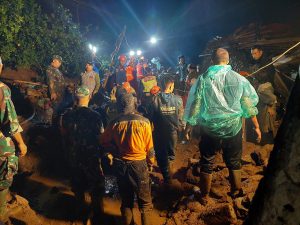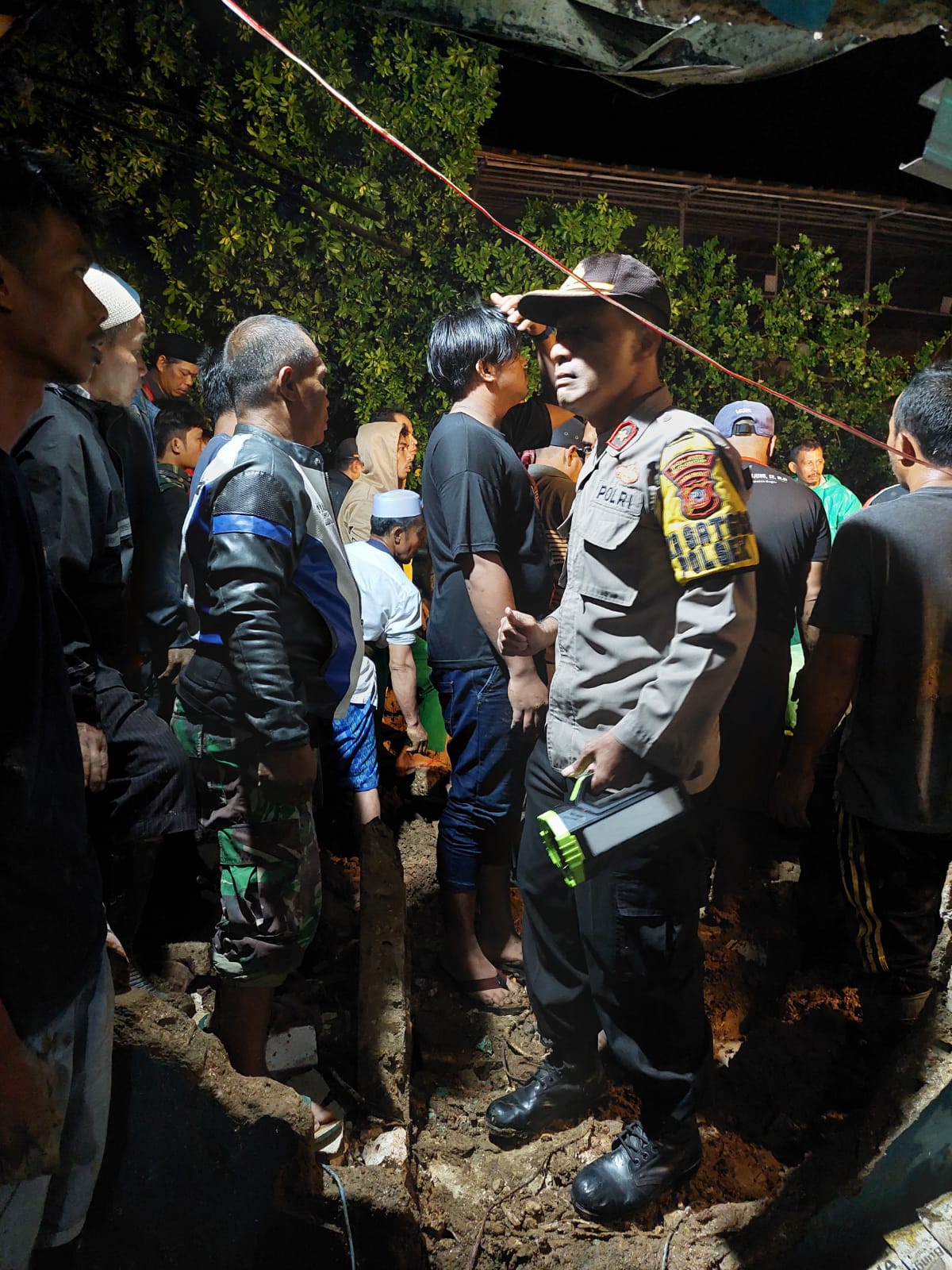 Gerbang Media Nasional Laporan : M Taufik BOGOR, GMN – Polres Bogor, Bencana tanah longsor kembali terjadi di wilayah Kecamatan Cijeruk Kabupaten Bogor yang mana kejadian tersebut terjadi di desa Cipelang Pada Sabtu sore (22/05) Tebing setinggi 10 meter yang longsor akibat dua rumah warga tertimbun, dan sebanyak 4 orang warga menjadi korban. Sementara itu 5 orang korban selamat dalam peristiwa itu. Kapolsek Cijeruk Kompol Sumijo SH, MH mengungkapkan saat ini kami bersama Sat Sabhara Polres Bogor, TNI, BPBD, Tim SAR dan Relawan terus melakukan pencarian terhadap para korban yang tertimbun. Kami yang melakukan pencarian hingga pukul 02.00 WIB tadi telah berhasil mengevakuasi 3 korban meninggal dunia yakni Uum (70), Duduk (43), Eneng (24), dan Nafis (4). Sementara itu satu orang yang hingga saat belum berhasil di temui adalah Eneng (24). Pagi ini kita bersama instansi terkait pun langsung melanjutkan pencarian terhadap korban. Kompol Sumijo menjelaskan bahwa kejadian tanah longsor ini Ialah akibat intensitas hujan yang cukup tinggi di wilayah Cijeruk beberapa hari belakangan ini, tutupnya. Post navigation Polsek Ciawi Berikan Sembako Kepada Mahasiswa Universitas Djuanda Bogor Minimalisir Banjir, BBWS sosialisasikan Pekerjaan Pemeliharaan berkala Bendungan Kamojing