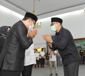 Gerbang Media Nasional Laporan : M Taufik BANDUNG, GMN – Setelah dinyatakan wafat Emmeril Kahn Mumtadz (Eril), putra Ridwan Kamil. Plt Bupati Bogor Iwan Setiawan didampingi Istri Halimatu Sadiyah langsung bertolak melakukan takziah dengan menemui Gubernur Jawa Barat Ridwan Kamil beserta keluarganya di Gedung Pakuan, Bandung, Minggu (5/6). Duka mendalam tidak hanya dirasakan Plt. Bupati Bogor Iwan Setiawan dan keluarganya saja. Tapi duka mendalam juga dirasakan warga Kabupaten Bogor. Bahkan Pemerintah Kabupaten Bogor di berbagai kesempatan senantiasa mengajak masyarakat untuk ikut mendoakan agar Eril lekas ditemukan . “Duka mendalam turut dirasakan dari semua warga Kabupaten Bogor. Doa terbaik kami panjatkan untuk ananda Eril,” ungkap Iwan Setiawan. Ia juga mengucapkan belasungkawa atas musibah yang menimpa keluarga Gubernur Jabar Ridwan Kamil. “Mudah-mudahan Eril diterima segala amal baiknya dan diampuni segala kekhilafannya,” ujarnya. Ia juga mendoakan agar Ridwan Kamil dan keluarga diberi ketabahan dan kekuatan dalam menghadapi musibah ini, karena orang tua manapun akan sangat terpukul hatinya ketika kehilangan anak. “Yakin almarhum meninggal syahid. Kita doakan semoga Kang Emil dan Teh Lia serta keluarga selalu diberikan kekuatan untuk tetap sabar dan ikhlas melewati ujian ini,” Iwan mendoakan. Post navigation Polsek Parung Panjang Gelar Olah TKP Penemuan Mayat Laki-Lak Layanan Bedah Syaraf Kini Hadir Di RSUD Cibinong