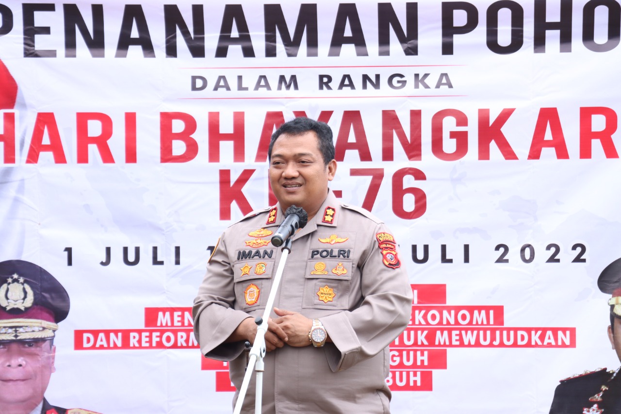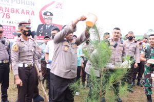 Gerbang Media Nasional Laporan : M Taufik BOGOR, GMN – Dalam memperingati HUT Bhayangkara ke 76 yang jatuh pada 1 Juli mendatang. Rangkaian penanaman pohon dilakukan serentak di 76 titik oleh Jajaran Polres Bogor. Yang mana 2.432 berbagai jenis pohon di tanaman secara serentak “Kegiatan penanaman pohon ini merupakan bagian dari rangkaian memperingati HUT Bhayangkara yang ke 76 pada 1 Juli mendatang, Menanam pohon merupakan satu upaya kami melestarikan lingkungan hidup,” kata Kapolres Bogor AKBP Dr. Iman ImanudiS.h., S.i.K., M.H diokasi 0 Kilometer Ciliwung, Puncak, Bogor, Pada Minggu 12 Juni 2022. Penanaman pohon ini akan membangun resapan yang lebih kuat untuk menahan air sehingga mencegah potensi longsor dan banjir. Selain lokasi ini, jajaran Polres Bogor menanam di 76 titik dengan total 2.432 pohon serentak dengan beragam jenis pohon seperti cemara, mahoni, hingga pohon buah. Program penanaman pohon ini akan terus berkelanjutan dengan melihat banyaknya lahan yang membutuhkan penghijauan. Kami bersama Pemkab Bogor akan mengajak masyarakat untuk menjaga pelestarian lingkungan hidup. Kita akan terus lakukan hala-hal kebaikan lainnya, seperti halnya, Polres Bogor menggelorakan gerakan satu hari satu kebaikan yang harus dilakukan oleh seluruh personil Polres Bogor. Penanaman pohon juga merupakan kelanjutan program ciliwung nanjung yang telah digagas jelasnya. Plt Bupati Bogor, Iwan Setiawan menyampaikan HUT Bhayangkara ke-76 yang diperingati Polres Bogor dengan kegiatan menanam pohon ini merupakan bentuk pesan agar masyarakat menjaga lingkungan. “Bogor ini rawan bencana baik itu longsor ataupun banjir. Makanya dengan penanaman pohon ini memberikan pesan ke masyarakat di perbanyak lah, dibudayakan menanam pohon untuk menyerap air agar tidak langsung ke sungai,” jelasnya. Iwan mengakui seiring bertambahnya waktu daerah resapan di wilayah Puncak Bogor berkurang. Sehingga diperlukan langkah kongkrit bagi para pemilik vila dan hotel yang over Koefisien Dasar Bangunan (KDB). Selain itu, Kabupaten Bogor memiliki Perda LP2B (Perlindungan Lahan Pertanian Pangan Berkelanjutan) yang mengatur wilayah agar tidak bisa diurus perizinan pembangunan. Dan perda ini masih terus ditegakkan dan diawasi. “Saya wacanakan harus berkewajiban mengkonfersi itu bagaimana mereka membeli tanah di sekitar dna di luar untuk ditanami pohon, itu salah satu solusi agar di Bogor tidak banyak daerah tutupan resapan akibat bangunan,” jelasnya. Iwan mengungkap cuaca hujan ekstrem pekan lalu di wilayah Puncak, mengakibatkan air meluap hingga ke jalan dan ke sungai. Dengan digaungkannya penanaman pohon ini bisa diikuti masyarakat. Salah satu penjabaran kegiatan penanaman pohon, kata Iwan, melalui ide Polres Bogor penanaman di lingkungan warga dan vila. “Beliau punya program ke depan menanam pohon di setiap lingkungan dan kami juga selaras mengikuti program yang baik. Kami meminta dan mengimbau seluruh masyarakat baik itu pemukiman warga maupun pemilik vila di wilayah pegunungan khususnya di wilayah puncak ini untuk menanam pohon di setiap tempat halaman dan pinggir jalan agar mengurangi longsor,” jelas Iwan. Hut Bhayangkara ke 76 bertajuk, “Polri yang presisi, mendukung pemulihan ekonomi dan reformasi struktural untuk mengwujudkan Indonesia tangguh, Indonesia Tumbuh”. Dalam penanaman yang dipimpin Kapolres Bogor AKBP Iman Imanudin ini dihadiri Plt Bupati Bogor Iwan Setiawan, Dandim 0621 Bogor Letkol Gangan Rusgandara, dan juga didampingi Kepala BPN/ATR Cibinong Yan Septedyas dan Kejaksaan Negeri Cibinong. Post navigation Tingkatkan Disiplin Anggota Dalam Gelaran Operasi Patuh Lodaya 2022, Propam Polres Gelar Penegakan Disiplin Anggota Jajaran Polres Bogor Tanam Pohon Serentak Peringati HUT ke-76 Bhayangkara ke-76