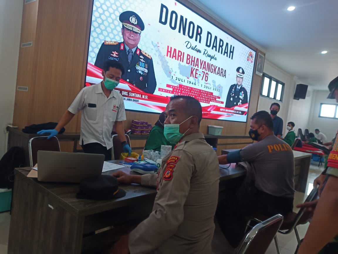 Gerbang Media Nasional Laporan :M Taufik BOGOR, GMN – Ratusan personil dari Jajaran Polres Bogor, Kodim 0621 Kabupaten Bogor, Sat Pol PP, BPBD, dan Dishub Kabupaten Bogor ikuti kegiatan donor darah yang di gelar polres Bogor pada Selasa ( 07/06 ). Berlokasi di Aula Sanika Satyawada Polres Bogor, sebanyak total 223 personil mengikuti kegiatan bakti sosial donor darah tersebut. Yang mana sebelum melaksanakan donor darah , seluruh personil pun wajib melewati serangkaian pemeriksaan kesehatan terlebih dahulu. Kapolres Bogor AKBP Dr. Iman Imanuddin S.H., S.I.K., M.H yang turut hadir dalam acara donor darah tersebut pun mengungkapkan bahwa kegiatan ini merupakan wujud nyata kami dalam rangka menyambut HUT Bhayangkara yang ke 76. Selain itu kami pun membuat suatu program yakni satu hari satu kebaikan yang nantinya wajib di lakukan personil kami di jajaran Polres Bogor. Di harapkan melalui kegiatan – kegiatan sosial yang kita lakukan ini nantinya dapat membantu masyarakat banyak, ungkap AKBP Iman Imanuddin. Post navigation Kapolsek Jonggol evakuasi temu mayat di sungai Polda Jabar Gelar Donor Darah Jelang HUT Bhayangkara Ke -76 Tahun 2022