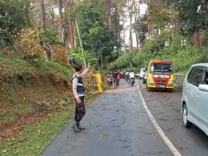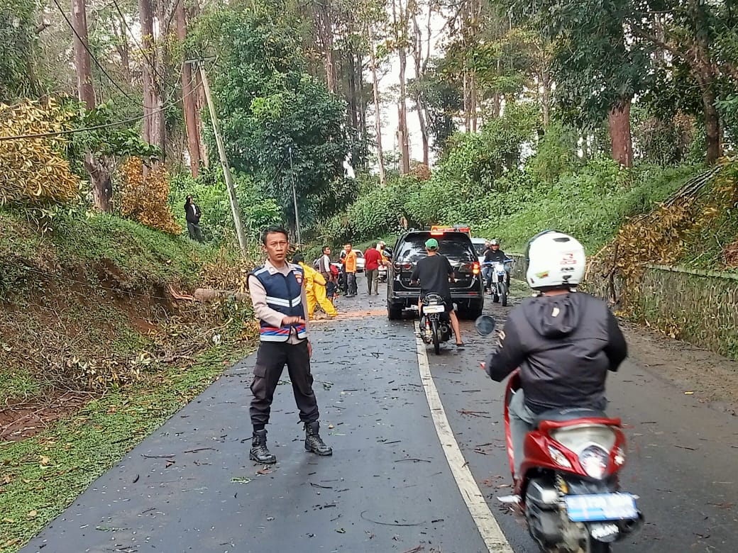 9Gerbang Media Nasional Laporan : M Taufik SUKABUMI, GMN – Hujan lebat yang mengguyur wilayah Kecamatan Cikidang Kabupaten Sukabumi menyebabkan pohon tumbang di jalan raya Cikidang tepatnya di Kampung Cipetir RT 04 RW 02 Desa Cicareuh Kecamatan Cikidang Kabupaten Sukabumi Minggu (14/08/2022). Menurut Kapolsek Cikidang Polres Sukabumi Polda Jabar AKP Aah Hermawan mengatakan ada satu batang roboh ke jalan dan menghalangi arus lalulintas pengendara motor baik roda empat maupun roda dua yang disebabkan hujan lebat sore tadi. “Petugas Kepolisian dibantu masyarakat telah berhasil memotong dan mengevakuasi pohon tumbang tersebut,” ungkap Aah Hermawan. Sementara ditempat terpisah Kabid Humas Polda Jabar Kombes Pol. Ibrahim Tompo S.I.K., M.Si mengatakan sesuai dengan jargon jiwa penolong, Polisi terus berupaya memberikan yang terbaik bagi masyarakat, bukan hanya membantu memotong dan mengevakuasi pohon tumbang serta mengatur lalu lintas, tapi kegiatan sosial lainnya. “Kepada masyarakat pengguna jalan diharapkan berhati – hati dan waspada terhadap kondisi cuaca, terlebih saat kondisi hujan.” imbau ibrahim Tompo. Menurut Aah Hermawan saat ini arus lalulintas sudah berjalan normal kembali dan kejadian pohon tumbang itu tidak mengakibatkan korban jiwa. Post navigation Hujan Deras dan Angin Kencang Sebabkan Papan Reklame di Babakan Madang Roboh Polsek Parung Panjang Amankan Seorang Laki-Laki Yang Diduga Pelaku Tindak Pidana Pencurian di Perumahan Foresthill