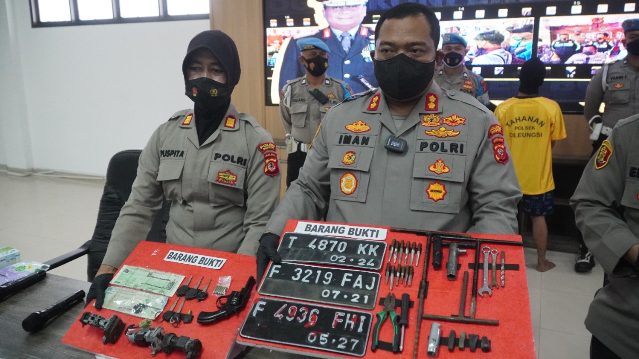 Gerbang Media Nasional Laporan : M Taufik BOGOR, GMN – Aksi pencurian sepeda motor yang terjadi pada 8 November 2021 lalu berhasil di Ungkap Jajaran Polsek Cileungsi Polres Bogor Pada 3 Agustus 2022, Sebanyak 2 Pelaku berhasil di Tangkap dan 2 orang lainnya berstatus DPO. Kapolres Bogor AKBP Dr. Iman Imanuddin S.H., S.I.K., M.H menjelaskan bahwa kejadian ini terjadi sekitar bulan November tahun lalu, yang mana para pelaku ini menggasak dua unit sepeda motor Honda Beat dan Honda Vario yang terparkir di warung nasi yang berada di desa Dayeuh kecamatan Cileungsi. Kami yang meniinjak lanjuti laporan terkait aksi pencurian tersebut melakukan penyelidikan terhadap para pelaku yang aksinya terekaman CCTV di sekitar lokasi kejadian. dari penyelidikan tersebut berhasil kita amankan seorang pelaku berinisial A. dari pengakuan A ini dirinya tidak melakukan pencurian seorang diri melainkan bersama tiga orang rekannya. Kami yang melakukan pengejaran terhadap pelaku lainnya berhasil mengamankan seorang pelaku berinisial CA. Sementara itu dua orang pelaku lainnya yang identitas telah kami ketahui ini masih dalam pengejaran. Paleku A sendiri telah melakukan pencurian sepeda motor sejak 1995 dan telah melakukan pencurian 141 TKP di wilayah Cileungsi, Klapanunggal, Gb.Putri dan wilatah Cibubur Sementara tersangka CA ini telah melakukan pencurian sepeda motor sejak tahun 2011. Dari tangan para tersangka ini kita aman juga barang bukti berupa 1 pucuk senjata api, 5 buah kunci later T, 12 anak kunci, 1 buah tang, 3 buah stop kontak sepeda motor, 5 buah kunci kontak, 1 buah kunci gembok, 2 buah kunci pas dan 1 buah obeng. Atas perbuatannya para tersangka ini akan kita jerat dengan pasal 365 KUHP dengan ancaman maksimal 9 tahun penjara, ungkap Kapolres Bogor AKBP Iman Imanuddin. Post navigation Delapan Orang Pelaku Pencabulan Anak di Bawah Umur di Ungkap Sat Reskrim Polres Bogor Polres Bogor Amankan Pelaku Pemalsuan Tiket Pertandingan Sepak Bola