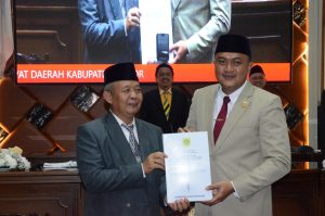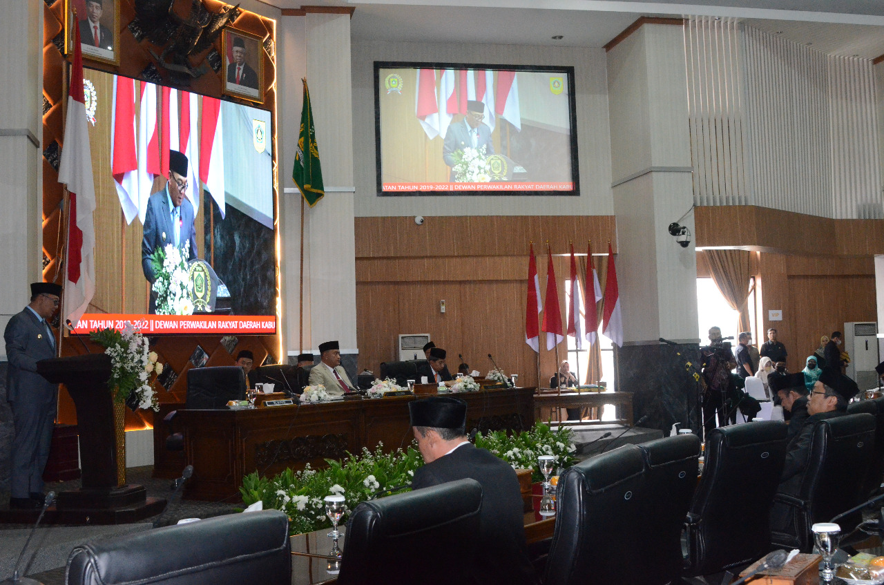Gerbang Media Nasional Laporan : M Taufik BOGOR, GMN – Plt. Bupati Bogor Iwan Setiawan bersama DPRD Kabupaten Bogor lakukan Penyampaian Rancangan Perubahan Anggaran Pendapatan dan Belanja Daerah Tahun Anggaran 2022, sekaligus melakukan sumpah janji pengganti antar waktu Anggota DPRD Kabupaten Bogor tahun 2019-2024. Yakni, Yuyud Wahyudin Anggota DPRD Kabupaten Bogor Fraksi Persatuan Pembangunan Bangsa, menggantikan Ahmad Pusni Anggota DPRD Kabupaten Bogor karena meninggal dunia. Rapat Paripurna berlangsung di Ruang Rapat Paripurna DPRD Kabupaten Bogor, Kamis (29/9/22). Plt. Bupati Bogor, Iwan Setiawan mengatakan bahwa beberapa poin yang tertuang dalam dokumen APBD perubahan tahun 2022, antara lain terdapat kegiatan yang bersumber dari penerimaan dana transfer, seperti dana alokasi umum, dan dana bagi hasil baik dari pemerintah pusat maupun pemerintah provinsi. “Kemudian penganggaran gaji dan tunjangan PPPK, perubahan pada belanja bagi hasil pajak dan retribusi daerah kepada desa, serta perubahan belanja bantuan keuangan kepada desa atau Samisade”, terang Plt. Bupati Bogor. Untuk diketahui, sebagai gambaran umum mengenai Rancangan Anggaran Pendapatan dan Belanja Daerah Perubahan Tahun Anggaran 2022 yakni, Pendapatan Daerah Ditargetkan Sebesar 8 Triliun 736 Milyar Rupiah, Belanja Daerah ditargetkan sebesar 9 Triliun 970 Milyar Rupiah, dan Pembiayaan Daerah ditargetkan sebesar 684 Miliar Rupiah. Post navigation Percasi Kabupaten Bogor Targetkan 7 Emas Pada Porprov XIV Jabar 2022 Polsek Parung Polres Bogor Amankan Seorang Remaja Yang Membawa Sajam