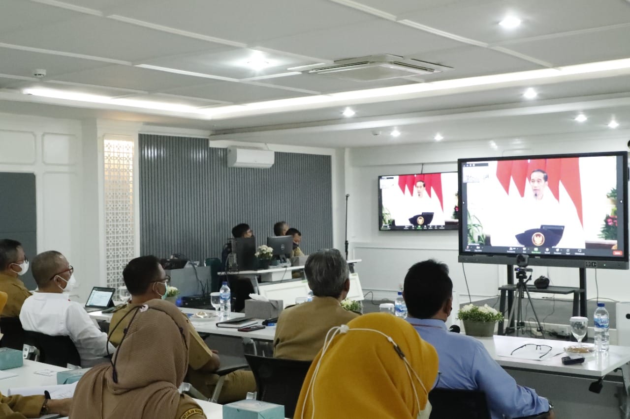 Gerbang Media Nasional Laporan : M Taufik BOGOR, GMN – Plt. Bupati Bogor, Iwan Setiawan mengikuti arahan Presiden Republik Indonesia, Joko Widodo terkait pengendalian inflasi di daerah, Rapat Koordinasi dilakukan secara hybrid di Ruang Rapat I, Sekretariat Daerah, Cibinong, Senin (12/9). Pada kesempatan tersebut Presiden Jokowi meminta pemerintah daerah dan pemerintah pusat bekerja bersama dan serentak seperti saat mengatasi Covid-19. Hadir mendampingi Plt. Bupati Bogor, Plt. Asisten Administrasi, Kepala Dinas Perdagangan dan Perindustrian, Kepala Dinas Penanaman Modal dan Perizinan Terpadu Satu Pintu (DPMPTSP), Inspektur, Kepala Dinas Komunikasi dan Informatika, Kepala Dinas Pemberdayaan Masyarakat dan Desa, Kepala Dinas Koperasi dan UMKM, dan Kepala Dinas Perhubungan. Presiden Jokowi menjelaskan, untuk membantu dampak kenaikan BBM, saya minta pemerintah provinsi, kabupaten dan kota ikut secara detail bersama-sama pemerintah pusat membantu yang terdampak akibat penyesuaian harga BBM. Kemudian untuk menanggulangi dampak inflasi, saya minta kepada Gubernur, Bupati dan Walikota agar bersama-sama pemerintah pusat bekerja bersama seperti saat kita bekerja serentak mengatasi Covid-19. “Saya yakin jika itu kita lakukan, inflasi di tahun ini bisa dikembalikan ke bawah 6 persen. Kita harus bekerja lebih detail, karena yang ditakuti oleh semua negara adalah inflasi, atau kenaikan barang dan jasa. Kita berharap negara kita bisa mengendalikan inflasi dengan baik,” tandas Jokowi. Kemudian Presiden Jokowi mengingatkan, hati-hati jika ada kenaikan harga pangan, karena kontribusi harga pangan terhadap kemiskinan yakni 74 persen. Begitu harga pangan naik, artinya di sebuah daerah kemiskinan nya juga akan terbawa naik,” ungkap Jokowi. “Komponen utamanya adalah harga beras, ketika ada kenaikan harga beras segera lakukan intervensi, karena itu menyangkut angka kemiskinan di provinsi, kabupaten dan kota. Kalau semua ini dilakukan daerah, kita bisa menahan laju inflasi agar tidak naik,” ungkap Jokowi. Post navigation Melalui Boling, Plt. Bupati Bogor Tegaskan Bantuan Samisade Akan Dicairkan Dalam Waktu Dekat Momentum Upacara Gelar Senja, Pemkab Bogor Ciptakan Anggota Pramuka Berkarakter dan Cinta Tanah Air