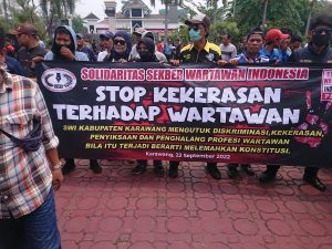 Karawang, GMN – Tak adanya tindakan tegas Bupati Karawang terhadap aksi biadab oknum pejabat ASN berinisial A, ribuan wartawan dari berbagai daerah yang tergabung dalam Aliansi Wartawan dari Subang, Purwakarta, Bekasi, Depok, Jakarta dan Karawang itu sendiri menggelar aksi demo di kantor Pemerintah Daerah Karawang, Kamis (22/9/2022).