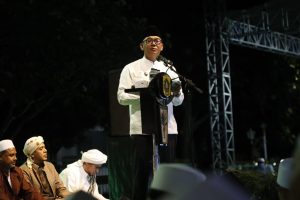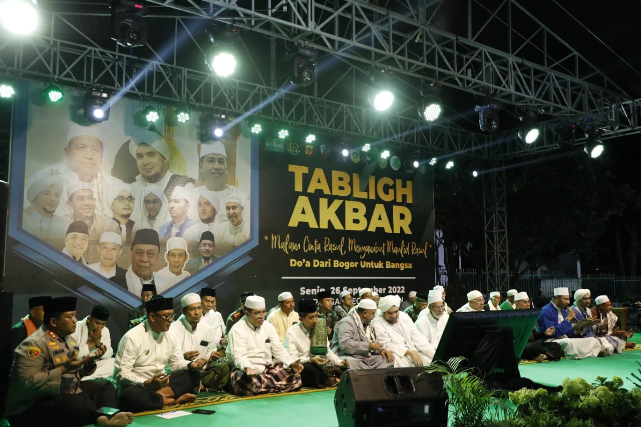 Gerbang Media Nasional Laporan : M Taufik BOGOR, GMN – Peringati Maulid Nabi Muhammad SAW tahun 1444 Hijriah, Pemerintah Kabupaten (Pemkab) Bogor gelar kegiatan tabligh akbar yang berlangsung di Lapangan Tegar Beriman bada Isya, Senin (26/9/22). Dalam kesempatan ini, Plt. Bupati Bogor Iwan Setiawan menegaskan bahwa hendaknya kegiatan tabligh akbar dapat dijadikan momentum untuk merefleksi diri, saling mendoakan, mempererat persaudaraan, memperkuat sinergi dan kolaborasi guna menjaga kondusivitas dan membangun Kabupaten Bogor dan Indonesia yang kita cintai. Perlu diketahui bahwa, saat ini Pemkab Bogor tengah dihadapkan pada tantangan dan dinamika sosial maupun ekonomi di masyarakat, sehingga perlu memperkuat solidaritas dan soliditas segenap pemangku kepentingan, dengan cara saling menguatkan antara ulama, dan umaro untuk bersama-sama menjawab tantangan dan menciptakan kodusivitas di masyarakat. Plt. Bupati Bogor, Iwan Setiawan menerangkan bahwa bagi Pemerintah Kabupaten Bogor kekuatan moral spiritual sangat penting sebagai modal dasar pembangunan. Maka dari itu, ulama dan umaro sama-sama memiliki tanggung jawab untuk menjaga, menguatkan dan menyatukan umat, bangsa dan negara. “Semoga kegiatan tabligh akbar, doa dari Bogor untuk bangsa ini, dapat memperkuat ukhuwah islamiyah dan jejaring hablumminannas, saling menghargai dan senantiasa tolong menolong dalam kabaikan dan kebajikan demi kemaslahatan umat. Sebagaimana Rasulullah Muhammad SAW mengajarkan kita semua untuk berempati, memberikan rasa aman, meneguhkan perdamaian dan belas kasih sesama umat, ” ujarnya. Dirinya juga menyatakan, terima kasih dan penghargaan setinggi-tingginya kepada jajaran Forkopimda, aparatur, alim ulama, tokoh/organisasi masyarakat dan seluruh komunitas masyarakat sipil yang selama ini turut serta menciptakan kondusivitas di wilayah Kabupaten Bogor. Selanjutnya, Kapolres Bogor, AKBP Iman Imanuddin, selaku ketua pelaksana mengatakan, kegiatan tabligh akbar dalam rangka memperingati Maulid Nabi Muhammad SAW menjadi sarana belajar, menggali ilmu dalam meneladani sifat-sifat terpuji Rasulullah yang penuh dengan perdamaian dan cinta kasih. “Di malam yang penuh barokah ini mari sama-sama menggali ilmu bersama dengan seluruh para habib, alim ulama dan lainnya. Semoga kita semua ke depan senantiasa dalam lindungan dan ridho Allah SWT,” imbuhnya. Post navigation JAGA MARWAH INSTITUSI DENGAN MENGHINDARI PERBUATAN YANG DAPAT MENURUNKAN CITRA POLRI Viral Sekelompok Remaja Konvoi kendaraan Sambil Acungkan Sajam, Polsek Parung Polres Bogor Bertindak Cepat
