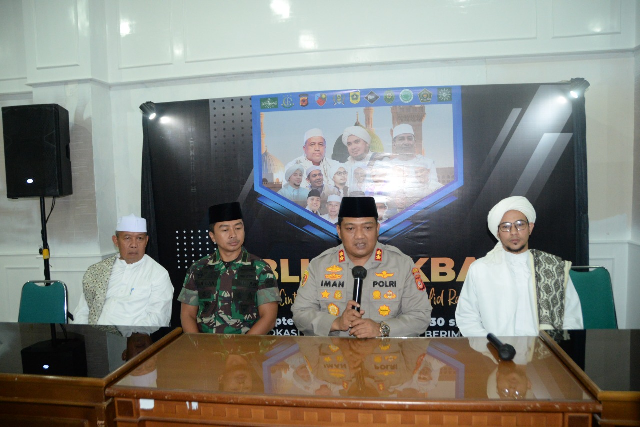 Gerbang Media Nasional Indonesia Laporan : M Taufik BOGOR, GMN – Tabligh Akbar Malam cinta rasul, menyambut maulid Nabi yang di gelar Forkopimda Kabupaten Bogor Pada Senin malam (27/09) di Lapangan Tegar Beriman, Cibinong Bogor penuh sesak di hadiri umat Islam yang mengumandangkan sholawat persatuan. Kegiatan yang di hadiri Forkopimda Kabupaten Bogor, seluruh habib dan ulama, instansi pemerintahan serta masyarakat umum tersebut berlangsung dengan penuh hikmat. Shalat Nabi terus berkumandang sejak di mulainya acara hingga berakhirnya acara tersebut. Para ulama dan habaib dalam tabliq Akbar tersebut mengajak seluruh umat Islam dapat meneladani Nabi Muhammad SAW. Kapolres Bogor AKBP Dr. Iman Imnuddin S.H., S.I.K., M.H Selaku Ketua Pelaksanaan Kegiatan Tabliq Akbar mengucapkan terima kasih kepada semua pihak yang telah menyukseskan terselenggaranya kegiatan tabliq Akbar Malam Cinta Rasul, Menyambut Maulid Nabi. Dengan telah di selenggarakannya kegiatan ini mudah-mudahan kita semua dapat mengambil ilmu dan meneladani sifat-sifat terpuji Rasulullah. Selain itu dalam forum ini juga kita dapat menggali ilmu dari para habib dan ulama sehingga kita memperoleh wawasan, memperoleh pengetahuan yang luas sebagai tambahan wawasan dan pengetahuan yang selama ini juga telah kita miliki.Sehingga dapat di jadikan pedoman dalam menjalankan kehidupan berbangsa dan bernegara. Kami bersama Umaroh dan habib akan terus bersinergi dalam memberikan pelayanan kepada masyarakat dalam berbagai hal. Apa yang kita lakukan antara ulama dan umaroh ini hanya semata-mata untuk masyarakat khususnya masyarakat kabupaten Bogor. Kami berharap kegiatan ini bukan hanya kegiatan yang sekali saja namun menjadi kegiatan yang menginisiasi kegiata- kegiatan lainnya di daerah lain sehingga di harapkan dapat menular ke seluruh tempat yang ada di wilayah Indonesia, Ungkap Kapolres Bogor AKBP Iman Imanuddin. Post navigation Viral Sekelompok Remaja Konvoi kendaraan Sambil Acungkan Sajam, Polsek Parung Polres Bogor Bertindak Cepat OLAHRAGA BERSAMA BHAYANGKARI DAERAH JAWA BARAT DALAM RANGKA HKGB KE – 70 TAHUN 2022 DI SPN POLDA JABAR