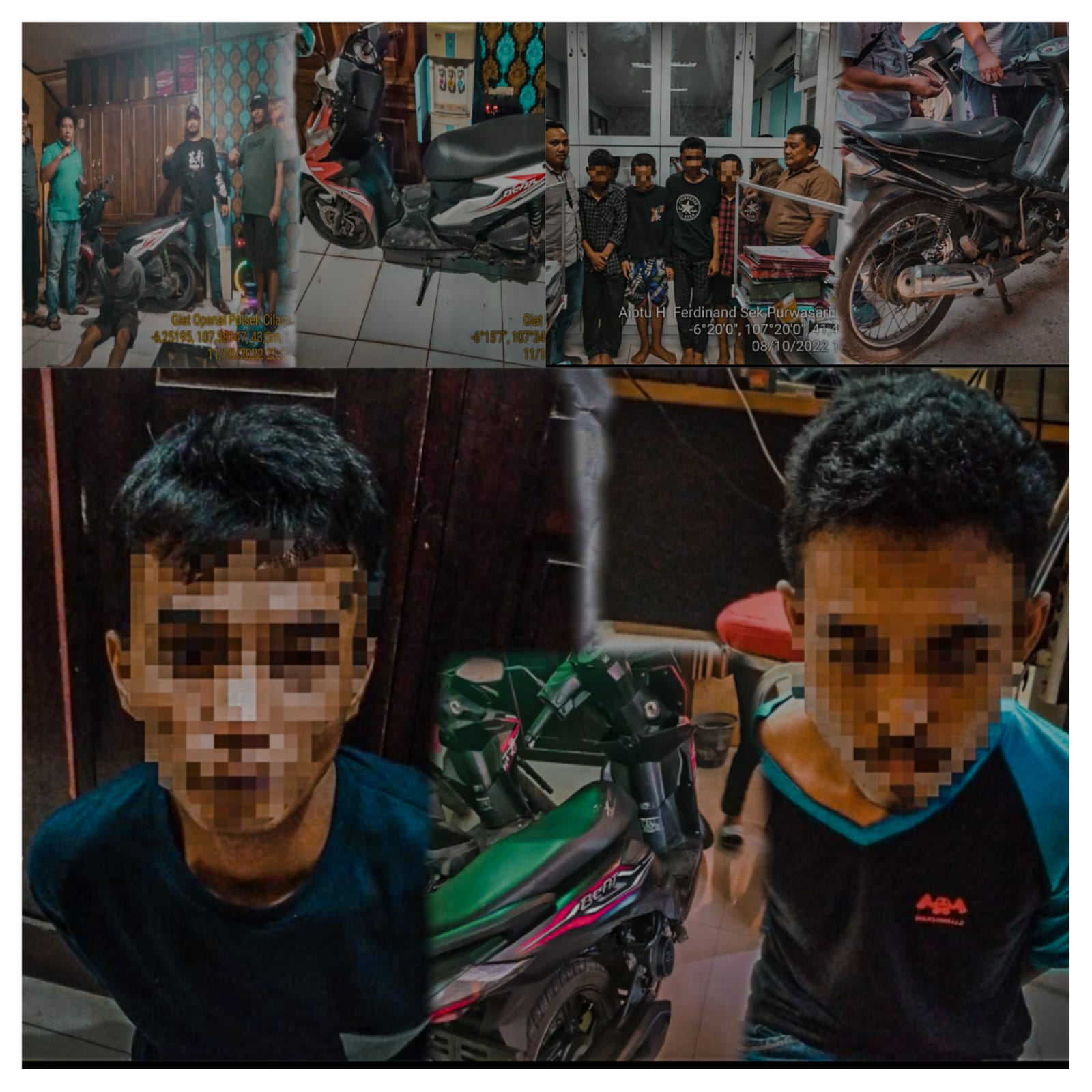 Sementara itu kasus Ciranmor di wilayah Polsek Purwasari tanggal 24 Sep 2022 yang berhasil lakukan penangkapan terhadap 4(Empat) orang tersangka dengan inisial A alias Oten 17 tahun, M.S 14 tahun, GI umur 14 tahun dan GI 15 tahun serta YM 15 tahun, para pelaku mencuri dua unit kendaraan R2 dengan Modus masuk rumah korban dan mencuri kendaraan korban.
