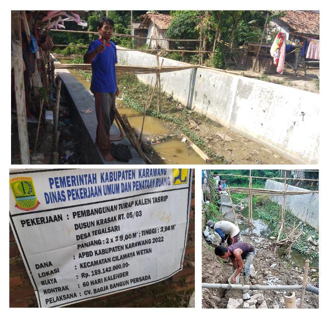 Gerbang Media Nasional Jurnalis : Rasim ( jawer ) Karwaang ,Media GMN – pembangunan saluran kalen tasrip sedang dilaksanakan oleh pemerintah kabupaten karawang dalam hal ini pelaksanaannya oleh dinas PUPR yang di kerjakan oleh rekanan pemborong CV BAGJA BANGUN PERSADA dengan pembiayaan dari APBD tahun 2022 sebesar Rp 189.142.000.(seratus delapan puluh sembilan juta seratus empat puluh dua ribu rupiah) volume panjang =2×29.00m” tinggi=2.80 m” selama 60 hari kalender dan mendapat apresiasi dari warga desa tegalsari kecamatan cilamaya wetan kabupaten karawangKarawang, 21 desember Dalam hal ini pengawas dari dinas terkait sering melakukan pengontrolan ke lokasi hampir seminggu 3x, bisa disimpulkan bahwa pekerjaan sudah sesuai spesifikasi & sudah di kerjakan sesuai petunjuk teknis ( juknis) di lapangan Menurut pendapat beberapa warga setempat anip(52) herman (45) yang memahami masalah pekerjaan proyek mengatakan bahwa pekerjaan ini sudah sesusi standar & terus di awasi oleh dinas terkait dikerjakan oleh tukang yg sudah berpengalam serta bahan material mempergunakan bahan yg berkualitas dan dapat disimpulkan pekerjaan ini sudah sesuai JUKNIS semoga pembangunan turap ini dapat memberikan manfaat bagi warga desa kami tuturnya. Post navigation Dpc Srikandi Indonesia Mendukung Penuh Rapat Panitia Mapag jawara Bersama Bamuswsri kab.Karawang Acungan jempol Buat tim respon cepat dari dinas PUPR kabupaten karawang Dan hasilnya sudah sesuai spesifikasi dan tidak ada kesalahan