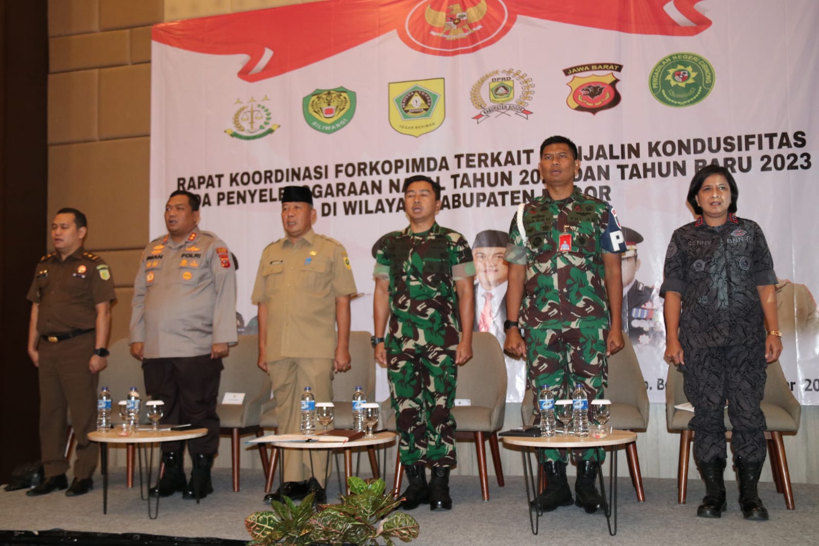 Gerbang Media Nasional Laporan : Hendi. H BOGOR, GMN – Untuk menjaga kondusivitas jelang perayaan Hari Natal tahun 2022 dan Tahun Baru 2023 (Nataru) Pemerintah Kabupaten (Pemkab) Bogor lakukan Rapat Koordinasi Forkopimda, yang digelar di Bigland Sentul Hotel & Convention Kecamatan Babakan Madang, Senin (19/12/22). Rapat Koordinasi dilakukan dalam rangka mengantisipasi peningkatan mobilisasi dan aktivitas masyarakat mendekati perayaan Natal tahun 2022 yang disertai cuti bersama dan perayaan malam pergantian tahun, sehingga perlu sinergitas dan koordinasi segenap stakeholder seperti Forkopimda, Pemda, TNI-Polri, tokoh/organisasi masyarakat dan segenap elemen masyarakat untuk menyatukan pemahaman, menyiapkan langkah preventif, antisipatif dan komprehensif, menjaga kondusivitas wilayah dan memberikan pelayanan terbaik bagi masyarakat. Sekda Kabupaten Bogor, Burhanudin mengungkapkan bahwa beberapa hal yang kiranya perlu menjadi perhatian bersama dan perlu dilakukan dengan meningkatkan koordinasi dengan pihak terkait mulai dari kondisi infrastruktur jalan, sarana-prasarana lalu lintas, rambu-rambu lalu lintas, penerangan jalan yang harus berfungsi dengan baik. Juga optimalisasi tim patroli, satgas personil gabungan agar meningkatkan kewaspadaan dengan memonitor terutama wilayah perbatasan dan wilayah yang rawan kemacetan seperti jalur Puncak. Meningkatkan pengamanan di tempat ibadah, tempat rekreasi, hiburan, wisata dan pusat perbelanjaan, pusat keramaian, dengan cara-cara yang humanis dan simpatik untuk menciptakan rasa aman di masyarakat mengingat peristiwa aksi terorisme yang baru saja terjadi di Bandung, kita perlu mewaspadai hal-hal yang tidak diinginkan. “Perlu koordinasi dengan pengelola rumah ibadah dan pemilik usaha, protokol kesehatan juga perlu tetap dijaga di tempat-tempat publik. Antisipasi gejolak sosial politik, idiologi yang menyebabkan pelanggaran terhadap komitmen kebangsaan, antisipasi kenaikan harga dan ketersediaan bahan pokok. Perlu diwaspadai bahwa akhir tahun biasanya curah hujan di Jawa Barat khususnya Kabupaten Bogor akan meningkat, ini juga harus kita antisipasi,” tegasnya. Lanjut sekda juga meminta kepada para camat untuk siaga di wilayah kerjanya masing-masing dengan berkoordinasi bersama Forkopimcam. Untuk itu semua perlu meningkatkan kewaspadaan dan kesiapsiagaan diri maupun satuan sehingga mampu merespon cepat dan tepat, setiap bentuk gangguan. “Para personil pengamanan agar tetap waspada dan jangan under estimate terhadap potensi gangguan yang ada. Strategi pengamanannya saya serahkan kepada pak Dandim dan Pak Kapolres, Satpol PP dan dinas terkait. Saya juga minta kepada seluruh Polsek, Babinkamtibmas untuk tetap waspada dalam menjaga dan menciptakan kondusivitas Perayaan Hari Natal dan Tahun Baru di Kabupaten Bogor,” imbuhnya. Post navigation Aktualisasikan Nilai Dasar Bela Negara, Pemkab Bogor Gelar Upacara HBN Ke-74 Secara Serentak DWP dan Pemkab Bogor Gaungkan Pentingnya Ketahanan Keluarga di Era Digitalisasi