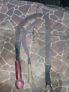bukti tiga buah senjata tajam, berupa dua buah celurit dan satu buah pedang.