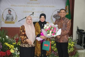 Gerbang Media Nasional Laporan : M Taufik BOGOR, GMN – Sekretaris Daerah (Sekda) Kabupaten Bogor Burhanudin menyatakan kehadiran Kepala Kantor Badan Pertanahan Kabupaten Bogor I yang baru, dapat memperkuat kolaborasi dan sinergi dengan Pemkab Bogor dalam memberikan layanan pertanahan kepada masyarakat. Itu diterangkan langsung oleh Sekda Kabupaten Bogor Burhanudin saat menghadiri kegiatan lepas sambut Kepala BPN Kabupaten Bogor I baru di Kantor BPN Kabupaten Bogor, Senin (20/3/23). “Secara pribadi dan atas nama Pemerintah Kabupaten Bogor saya ucapkan selamat datang kepada Ibu Yuliana Kepala Kantor BPN Kabupaten Bogor I yang baru. Semoga kehadiran ibu dapat meningkatkan sinergi dengan Pemkab Bogor baik dalam program, pelayanan maupun penanganan masalah pertanahan,” ujar Sekda. Lanjut Sekda menerangkan, bahwa selama ini sinergi dan kolaborasi antara Pemkab Bogor dengan BPN sudah berjalan dengan baik dan lancar. Sehingga berbagai permasalahan dapat diselesaikan bersama-sama mulai dari PTSL sampai dengan sertifikasi aset Pemda dan BUMD. “Saya ucapkan terima kasih dan penghargaan yang setinggi-tingginya kepada pak Yan Septedyas dan mohon maaf apabila terdapat hal-hal yang kurang berkenan di tengah kebersamaan kita dalam melaksanakan tugas. Semoga kinerja, sumbangsih selama bertugas di Kabupaten Bogor tercatat sebagai amal ibadah dan semakin sukses di tempat yang baru,” beber Burhanudin. Menurut Burhan, Pemerintah Kabupaten Bogor terus berupaya memperkuat sinergi antar segenap Forkopimda, Instansi Vertikal dan seluruh pemangku kepentingan demi tercapainya stabilitas daerah yang aman, damai dan kondusif dan terwujudnya Visi Kabupaten Bogor termaju, nyaman dan berkeadaban. Di tempat yang sama, Kepala Kantor BPN Kabupaten Bogor I, Yuliana mengungkapkan, siap untuk selalu bersinergi dan kolaborasi dengan Pemkab Bogor bahkan senantiasa meminta dukungan dari Pemkab Bogor juga Forkopimda Kabupaten Bogor agar BPN bisa selalu optimal dalam memberikan pelayanan pertanahan kepada masyarakat. Serta dapat menjalankan program-program yang berkaitan dengan pertanahan dengan baik. “Agar kami bisa memberikan kontribusi maksimal untuk Kabupaten Bogor,” terang Yuliana. Selanjutnya, Kepala BPN Tuban, Yan Septedyas menyatakan terimakasih kepada Pemerintah Kabupaten Bogor yang selalu mendukung ia dan BPN Kabupaten Bogor, bahkan atas dukungannya BPN sudah memiliki tiga kantor yakni BPN Kabupaten Bogor 1, 2 dan 3. “Terimakasih luar biasa bisa berkesempatan tugas di Kabupaten Bogor. Kami begitu solid dan sinergi dengan jajaran Pemkab Bogor juga Forkopimda, saya izin untuk pamitan ke Tuban. Untuk rekan-rekan semua, teruslah berbuat yang terbaik, jangan pernah berhenti untuk berbuat baik, seperti kata pepatah orang Padang, dimana bumi berpijak disitu langit dijunjung,” Yan mengakhiri.