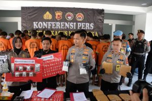 BOGOR, GERBANG MEDIA NASIONAL – Pihak kepolisian dari satuan Narkoba Polres Bogor berhasil melakukan pengungkapan terhadap pelaku jaringan peredaran narkotika jenis sabu, ganja tembakau sintetis, hingga sediaan Farmasi di wilayah Kabupaten Bogor. Kapolres Bogor AKBP Rio Wahyu Anggoro S.H.,S.I.K mengatakan bahwa dalam pengungkapan yang dilakukan dalam kurun waktu bulan Juni 2023 tersebut Sat Narkoba Polres Bogor berhasil mengamankan sebanyak 32 orang tersangka, berikut dengan total barang bukti sabu seberat 0,6 kilogram, ganja seberat 6,03 kilogram, tembakau sintetis 74,2 gram dan sediaan farmasi sebanyak 315 butir.(20/07/2023) Jaringan peredaran para pelaku yang kita amankan ini sendiri meliputi Wilayah Kabupaten Bogor dan wilayah Kota Depok. Para pelaku ini pun akan di jerat dengan Pasal 114 Ayat 2 Ayat 1, Pasal 112 Ayat 2 ayat 1 dan Pasal 111 Ayat 2 ayat 1 dengan ancaman hukuman minimal 12 tahun penjara, seumur hidup bahkan maksimal hukuman mati. Sementara itu dari pengungkapan yang berhasil kita lakukan ini, bila di konversikan telah menyelamatkan kurang lebih 9.500 Jiwa dari penyalahgunaan Narkotika. Saya menghimbau kepada seluruh lapisan masyarakat agar bisa memberikan informasi sekecil apapum kepada kami kepolisian untuk kita bersama-sama melakukan pemberantasan terhadap peredaran narkotika dan obat – obatan terlarang di Wilayah Kabupaten Bogor. Karena ini merupakan penyakit masyarakat yang sangat luar biasa yang bisa masuk ke segala lini kehidupan masyarakat, kita ingin masa depan anak- anak kita, masa depan pemuda – pemuda tidak hancur karena peredaran Narkotika ini. Untuk itu kepada seluruh masyarakat Kabupaten Bogor mari kita sama – sama berantas peredaran Narkotika agar kabupaten Bogor ini bersih dari Narkotika, Ungkap Kapolres Bogor AKBP Rio Wahyu Nugroho Anggoro. (Fik) Post navigation Halimatussadiyah Roadshow Monev Pelaksanaan 10 Program PKK di Desa Situ Daun KPAD Kabupaten Bogor Raih Anugerah KPAI Tahun 2023 Kategori KPAD Terbaik