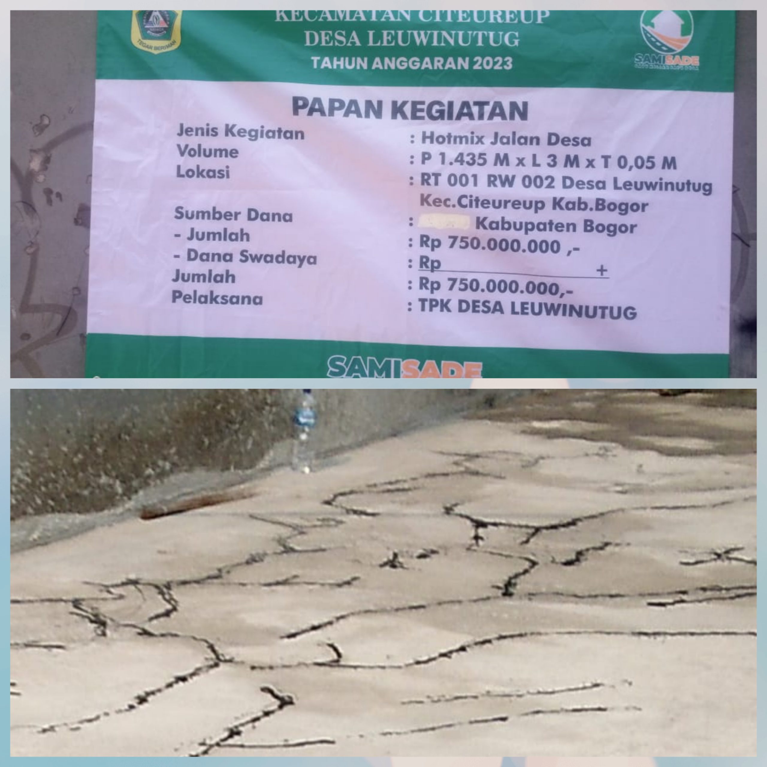 Dia juga mengaku bahwa pekerjaan tersebut ada yang tidak maksimal sehingga berimbas pada keretakan jalan. Jalan yang dianggarkan dari bantuan Pemkab Bogor ini utuk kegiatan tahapan I yaitu 129 M x 4 M x 0.15 M.