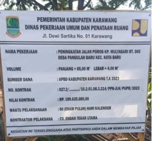 Peningkatan jalan poros yang beralamat di kampung Mulyasari bungin RT.005 desa Pangulah baru kecamatan kota baru kabupaten Karawang Jawa barat yang di kerjakan oleh rekanan kontraktor CV ENDAH TEGAR UTAMA panjang =85,00 M.lebar = 4,00 M. pagu anggaran 189.635. 0800,0 APBD kabupaten karwang tahun .anggaran 2023.