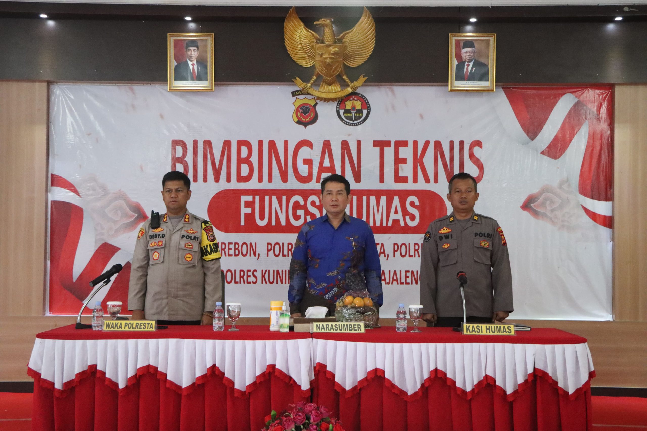 Puluhan personel Humas Polresta Cirebon, Polres Cirebon Kota, Polres Indramayu, Polres Majalengka, dan Polres Kuningan, mengikuti Bimbingan Teknis Kehumasan di Aula Pesat Gatra Mapolresta Cirebon, Rabu (1/11/2023).