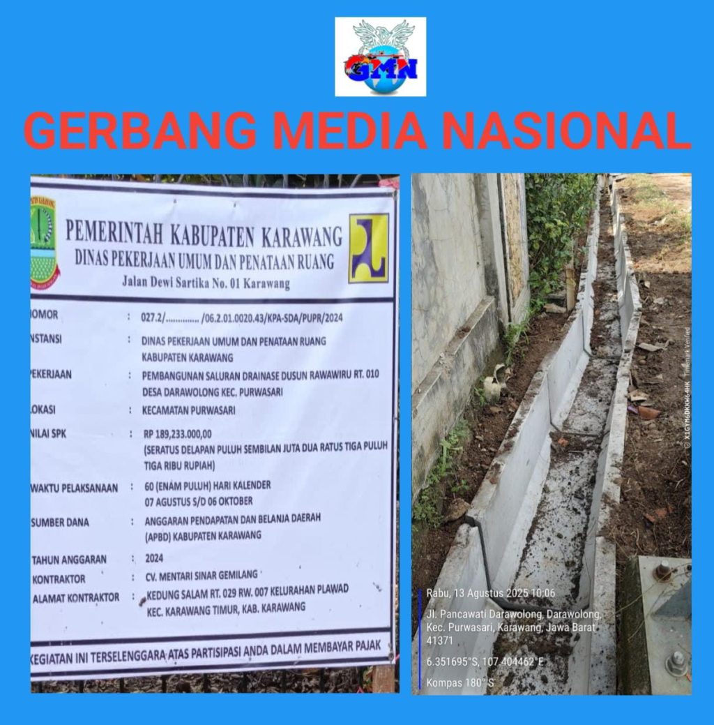 Karawang,GMN – Kegiatan proyek drainnase di dusun rawawiru RT 010 desa drawolong kecamatan Purwasari Kabupaten Karawang yang sedang berjalan dan dikerjakan oleh pihak rekanan kontraktor CV MENTARI SINAR GEMILANG menggunkan U- Dicth diduga tidak berstandar SNI dan tidak ada Pengawas dari pihak Dinas terkait, Diantara pekerjaan proyek tersebut berlokasi di dusun rawawiru RT 010