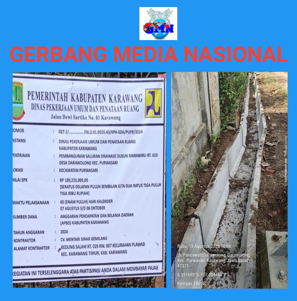 Gerbang Media Nasional Laporan : Cep Karawang,GMN – Kegiatan proyek drainnase di dusun rawawiru RT 010 desa drawolong kecamatan Purwasari Kabupaten Karawang yang sedang berjalan dan dikerjakan oleh pihak rekanan kontraktor CV MENTARI SINAR GEMILANG menggunkan U- Dicth diduga tidak berstandar SNI dan tidak ada Pengawas dari pihak Dinas terkait, Diantara pekerjaan proyek tersebut berlokasi di dusun rawawiru RT 010 Hal tersebut bisa menimbulkan masalah dikalangan kontraktor maupun Pelaksana Teknis ( Peltek) PPTK, Bahkan, Pengawas Pembuat Komitmen ( PPK ), yakni Dinas PUPR . Hasil pantauan/ Investigasi awak media dilapangan, ditemukan kegiatan proyek drainnase Konon dibuat asal jadi. Pasalnya U- Dicth yang digunakan diduga belum memenuhi standar SNI selain itu juga terlihat jelas tumpukan matrial U- Dicth tidak ada merk Disamping itu, saat pemasangan u-dicth -pun tidak memakai lantai dasar seperti pasir untuk fungsi mengikat agar u-dicht tersebut tidak bergeser bahkan terlihat juga pemasangannya bergelombang. Dilokasi pekerjaan juga tidak adanya pengawas dari pihak dinas dan pelaksanaan lapangan Saat awak media menemui salah satu pekerja dilokasi saat ditnya soal, volume panjang saluran ko tidak tertera di papan informasi pekerja menjawab tidaktau disini saya cuma kerja ” Saya tidak tahu soal volume dan u-dicth bermerk atau tidak, sebaiknya abang tanyakan saja pada mandor , yang dilapangan sebagai Pelaksana saat itu juga awak media mencoba menhubngi pengawas berinisial A dari dinas PUPR untuk konfirmasi lebih lanjut melaui pesan singkat whatsApp, ia malah bungkam dan tidak ada respon, dari pihak pengawas berinisial A Hingga berita ini ditayangkan pihak pengawas Dinas PUPR. dan pelaksana tidak ada respon Sementara itu, salahsatu warga setempat yang tidak mau di sebut namanya Mengatakan, Pembangunan Drainase/ Udith di dusun rawawiru RT /010 desa drawolong Pengawas Harus Tegas Pantau Kegiatan Proyek Drainase/ Udith tersebut Post navigation Diteror Perampok Bersenjata, Warga Karawang Kini Bisa Bernapas Lega Usai Polisi Tembak Mati Satu Pelaku DI DUGA PENGAWAS BUNGKAM, SAAT DI konfirmasi terkait proyek saluran drainase yang gunakan U DiTCH POLOS TANPA MEREK