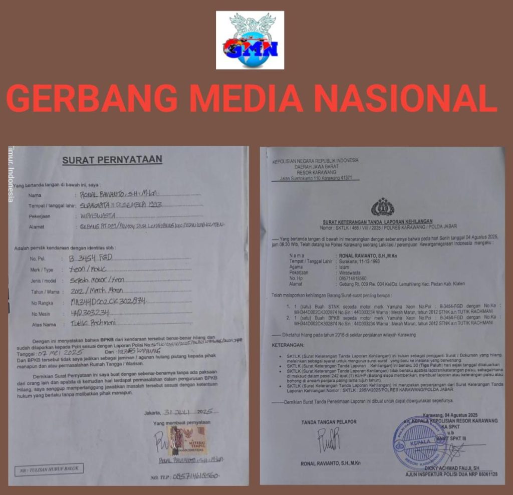 Karawang, GMN – seseorang bernama Ronal Ravianto,SH.,MKn. Merasa kehilangn 1 buah STNK sepeda motor merk : yamaha xeon